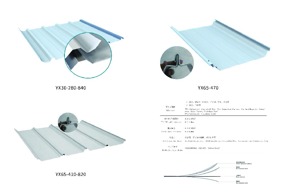 470 型(YX65-470),有效寬度 470mm,高肋深波,結(jié)構(gòu)強度高,抗風(fēng)抗雪、排水快,適合大跨度 / 低坡度 / 沿海臺風(fēng)區(qū);840 型(YX30-280-840),有效寬度 840mm,波高平緩,施工效率高、搭接少,適配常規(guī)中小跨度廠房、物流倉儲;820型(YX65-410-820),有效寬度820mm,采用360°直立鎖邊施工,瓦面無釘,接縫數(shù)量少,施工效率高。